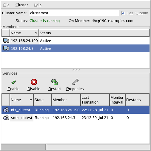To start the cluster software on a member, run the Cluster Status Tool and choose Cluster => Start Local Cluster Daemons. The cluster member's Status field changes from Disabled to Active.