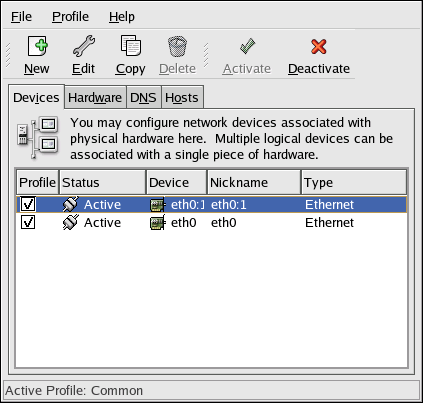 Figure 18-18 shows an example of one alias for the eth0 device. Notice the eth0:1 device — the first alias for eth0. The second alias for eth0 would have the device name eth0:2, and so on. To modify the settings for the device alias, such as whether to activate it at boot time and the alias number, select it from the list and click the Edit button.