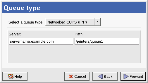 After clicking Forward, Figure 34-5 appears. Select Networked CUPS (IPP) from the Select a queue type menu.